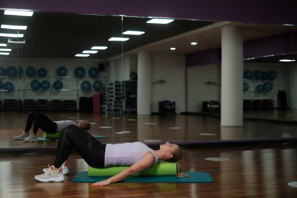 Для начала сделаем упражнение для снятия напряжения спины. Ложимся на ролл грудным отделом, размещая на нем область лопаток. Руками поддерживаем голову, чтобы не напрягать шею. Локти направляем вверх в потолок. Поднимаем таз так, чтобы центр тяжести сместился на грудной отдел спины. В этом положении прокатываем роллом середину спины до нижних ребер, не касаясь их. Делаем 12 повторений. Затем раскрываем локти в стороны и прокатываем еще 12 повторений.